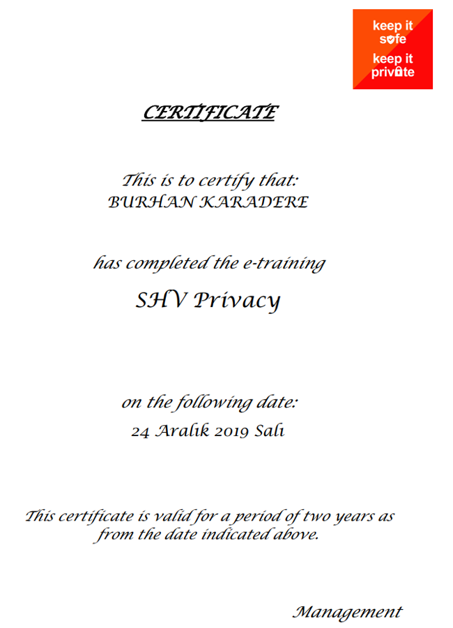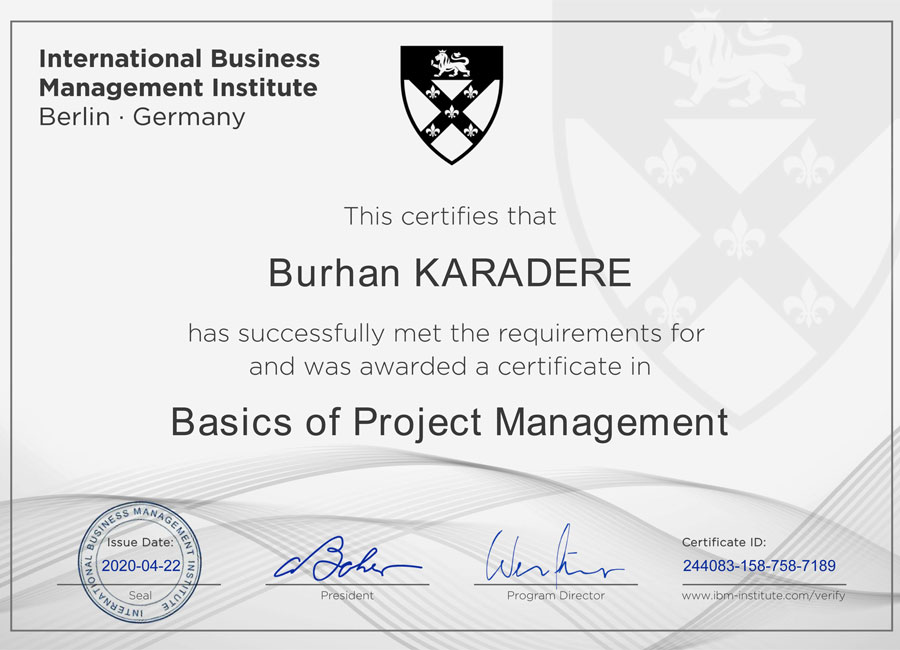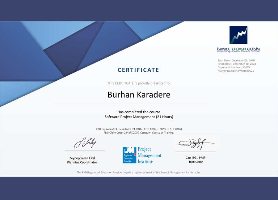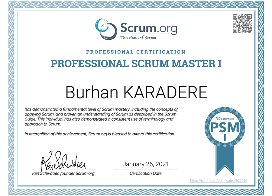 Scrum.Org 'un düzenlediği başarı kriterine göre alınan Scrum Master Proje yönetim sertifikası.