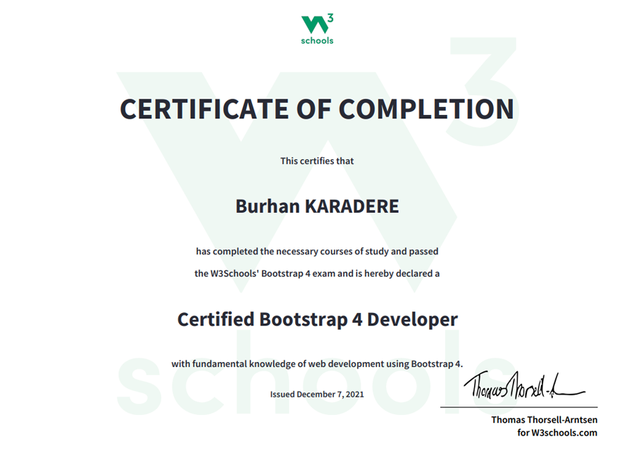 W3Schools düzenlediği Bootstrap 4 UX - User Experience sertifikası.