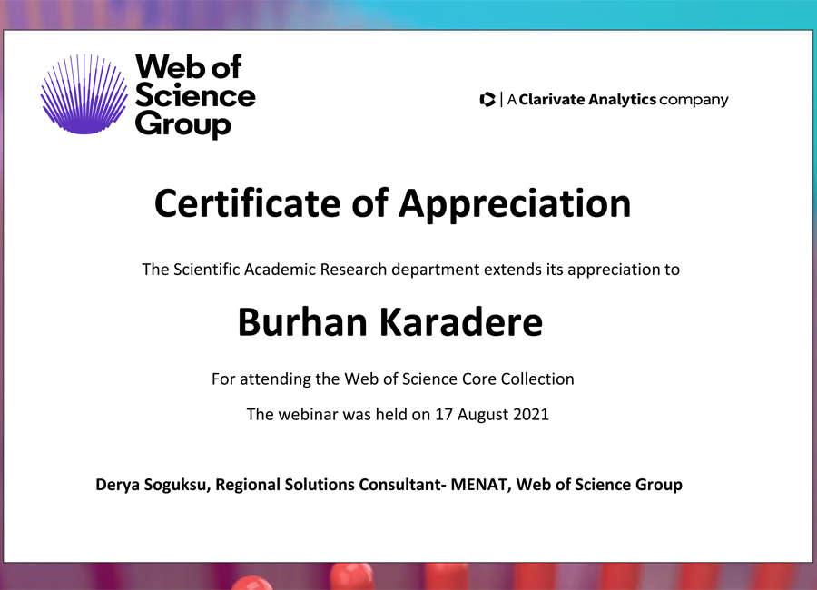 Web of Science Group firmasının düzenlediği Web of Science akademik araştırma programının eğitim belgesi.