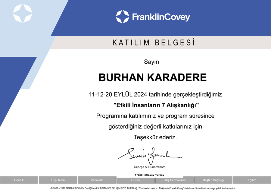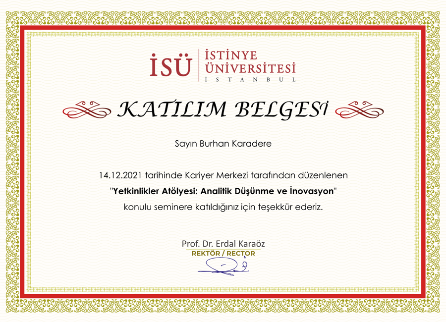 İSÜ - İstinye Üniversitesi Yetkinlik Atölyesi 'nin düzenlemiş olduğu "Analitik Düşünme ve İnovasyon" konulu seminere katılım belgesi.